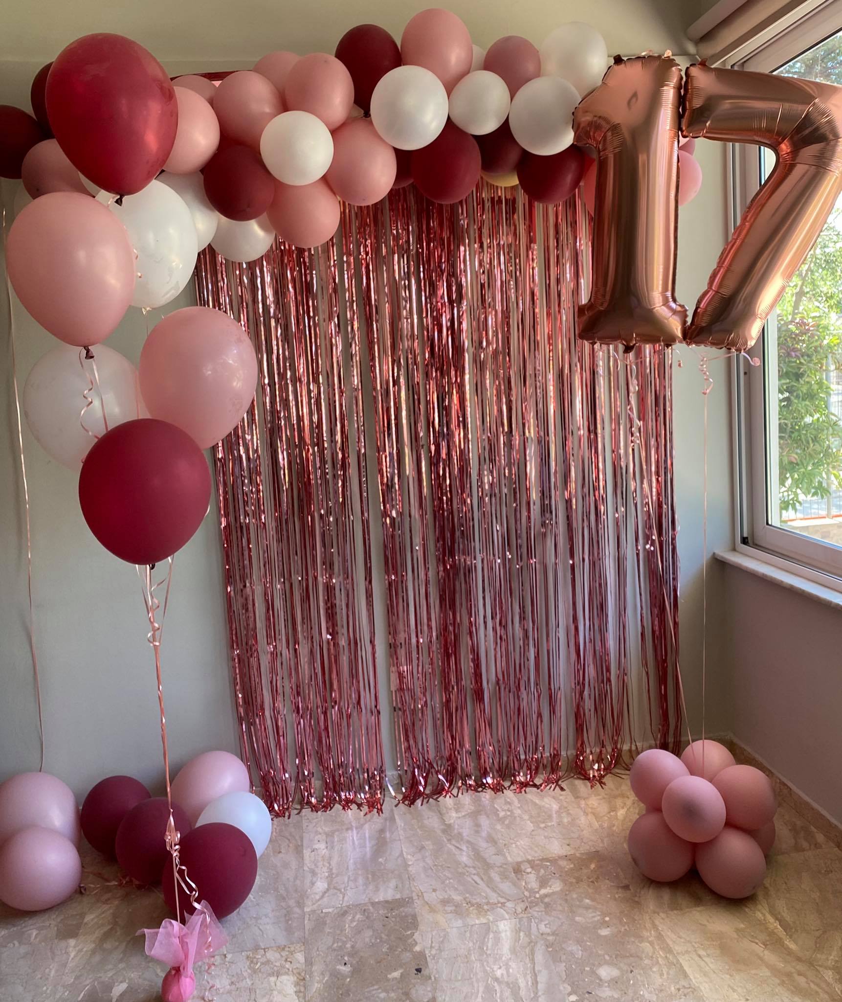 Το σετ αποτελείτε από δύο αριθμούς 2 μ οργανική γιρλάντα 1,80 κουρτίνα 6 ήλιον μπαλόνια κ 10 μπαλόνια στο πάτωμα.